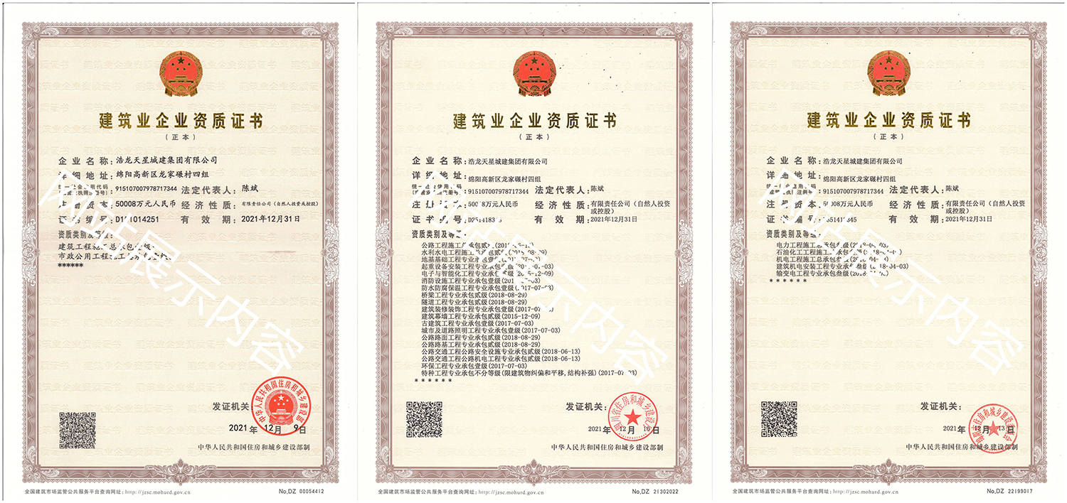 浩龍?zhí)煨浅墙瘓F(tuán)有限公司,2007年成立于“李白故鄉(xiāng)、中國科技城”—四川省綿陽市,企業(yè)注冊資本金5.0008億元。公司共有27項建筑業(yè)企業(yè)資質(zhì),其中國家一級資質(zhì)11項,二級資質(zhì)10項,三級資質(zhì)5項,特種資質(zhì)不分等級1項,類別涵蓋建筑、市政、水利、機(jī)電、隧道、起重設(shè)備安裝等基礎(chǔ)及未來發(fā)展重點(diǎn)專業(yè)。公司下設(shè)三個辦事處,業(yè)務(wù)范圍輻射全國,在建項目三十余個,累計完成產(chǎn)值超11億元。公司是綿陽市建筑施工企業(yè)協(xié)會副會長單位、綿陽遂寧商會會長級單位、綿陽首批建筑業(yè)綠卡企業(yè),在綿陽本地企業(yè)中綜合實力名列前茅。